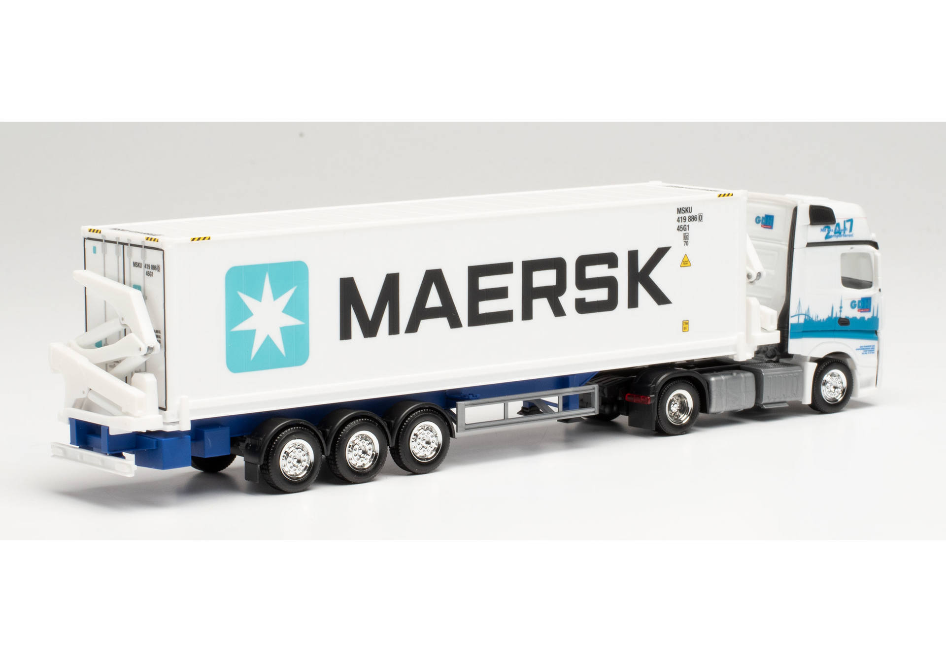 Einer der in Deutschland eingesetzten Hammar Container-Seitenlader wird von dem in Hamburg ansässigen Containerdienst GDH eingesetzt. Die Hebearme des Seitenladers sind bei diesem Modell vorbildgerecht in Weiß gehalten. Beladen ist der Sattelzug mit einem 40 ft. HC NYK-Container.