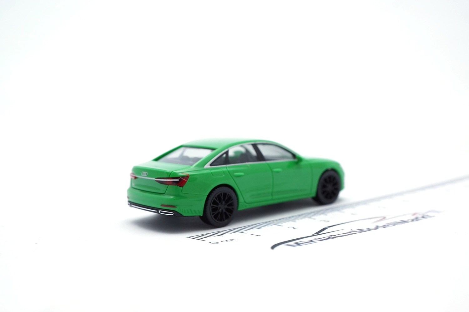 Die für den Audi A6 eher ungewöhnliche Farbgebung Kyalami Grün mit schwarzen Felgen setzt Herpa als Farbneuheit für das Programm um.