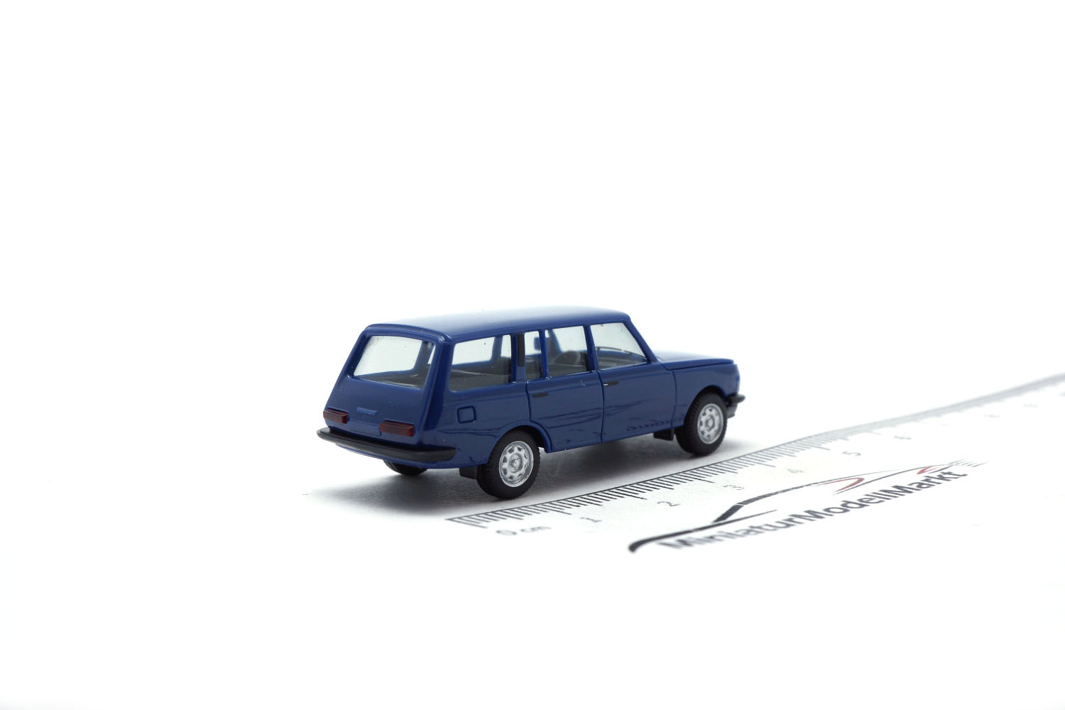 Auch der Tourist des Wartburg 353 wurde im Jahr 1984 bereits mit ersten Merkmalen der ‘85er Baureihe produziert. Auch bei diesem Fahrzeug waren Stoßfänger und der noch alte Kühlergrill in Schwarz gehalten. Das Herpa-Modell wird in Dunkelblau umgesetzt.
